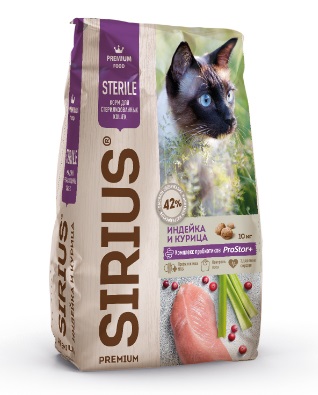 SIRIUS - сухой корм премиум класса для полноценного ежедневного рациона стерилизованных кошек. Высокое содержание мясных ингредиентов обеспечивает оптимальный уровень белка и укрепляет мышцы. Пониженное содержание жиров для контроля веса. Баланс витаминов и комплекса пробиотиков 4-го поколения PROSTOR+ нормализует пищеварение и укрепляет иммунитет. Омега 3 и Омега 6 способствуют поддержанию здоровья сердца, мозга, нервной системы, здоровья кожи и красоты шерсти. Корм способствует профилактике мочекаменной болезни.